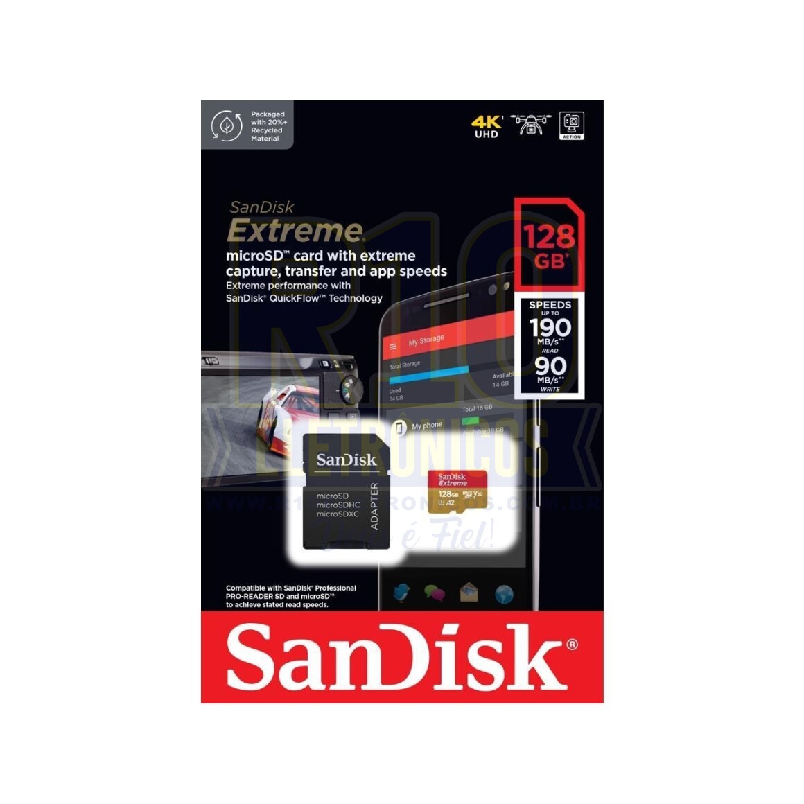 Projetado para dispositivos microSD, como smartphones, câmeras, drones ou câmeras de ação GoPro que podem capturar vídeo em Full HD, 3D e 4K, o cartão de memória Sandisk Extreme de 128Gb é compatível com o barramento UHS-I e possui uma classificação de velocidade de classe V30, que garante velocidades mínimas de gravação de 30 Mb/s. Se o seu dispositivo não suportar o padrão V30, este cartão suporta o padrão U3, que também garante velocidades mínimas de gravação de 30Mb/s. As velocidades de leitura são suportadas até 190 Mb/s e as de gravação atingem no máximo 90Mb/s.