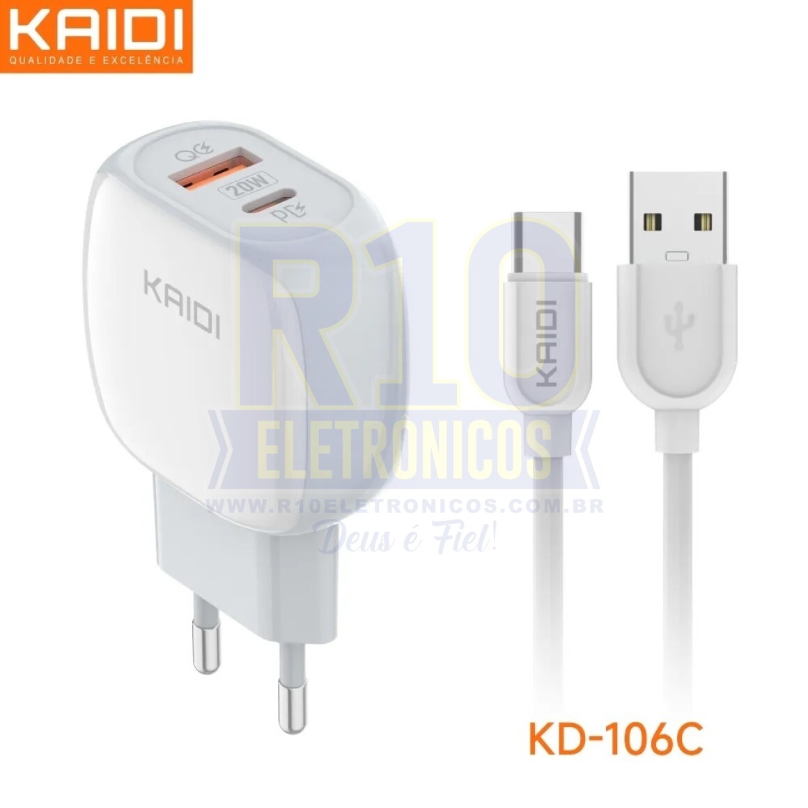Carregador Completo Kaidi PD+QC 3.0 Para Micro V8 / Iphone / Tipo-C Carregador Turbo KD-106/Cabo.