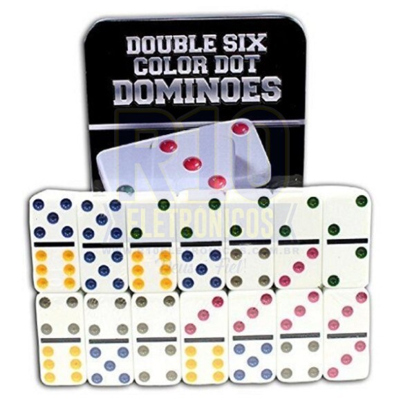 Avaliações (0) Jogo de dominó, 28 peças brancas com pontos coloridos.Dimensões das peças: 51,5 x 25,5 x 10,5 mm. Embalados em uma lata 19,5 x 11,5 x 3 cm. Peso total 635 g. Diversão para toda a família. Para 2 a 4 jogadores. Recomendado para crianças acima de 7 anos.