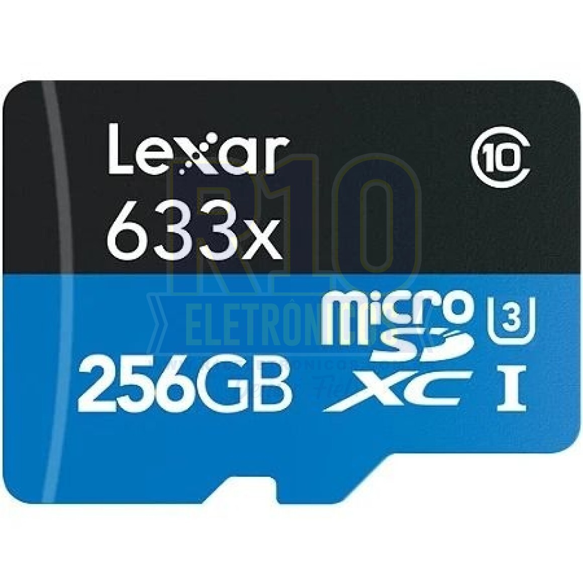 Projetado para filmadoras esportivas, tablets, smartphones e qualquer outro dispositivo compatível com microSDXC, o Cartão de Memória microSDXC de 256GB de Alto Desempenho 633x UHS-I da Lexar pode ser usado para gravar vídeos em Full HD, 3D e 4K. Este cartão tem uma capacidade de 256GB, é compatível com o barramento UHS-I e possui uma classificação de velocidade U3 e V30, ambas fornecendo velocidades mínimas de gravação de 30 MB/s. Caso seu dispositivo não suporte o barramento UHS-I, este cartão também suporta os padrões Classe 10, V10 e U1, todos com velocidades mínimas de gravação de 10 MB/s.