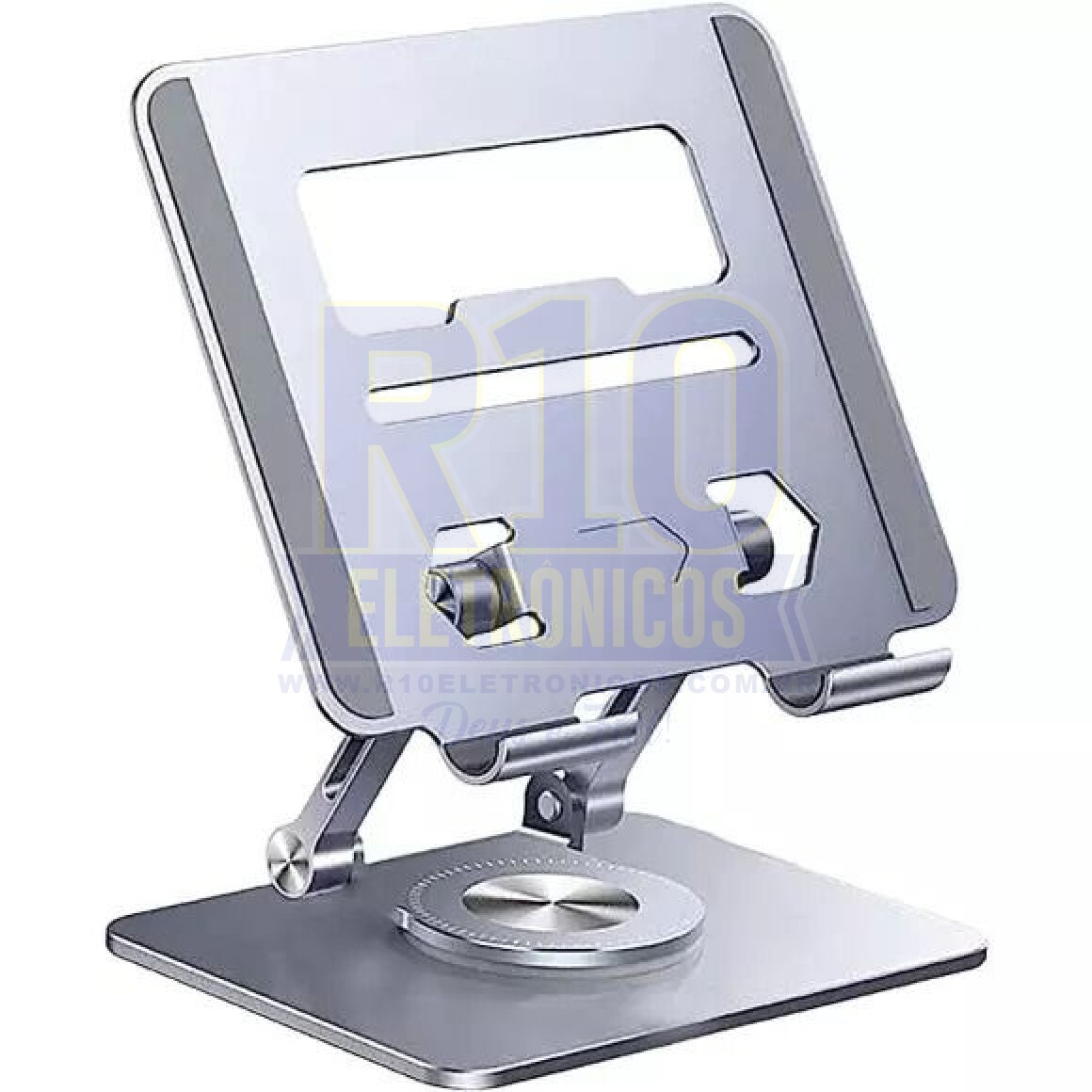Suporte Giratório 360° De Alumínio P/ Tablet Ate 12 Polegada' é um suporte dobrável e rotativo para tablets. Possui um chassi de rotação de 360°, proporcionando flexibilidade para girar o tablet em qualquer ângulo.