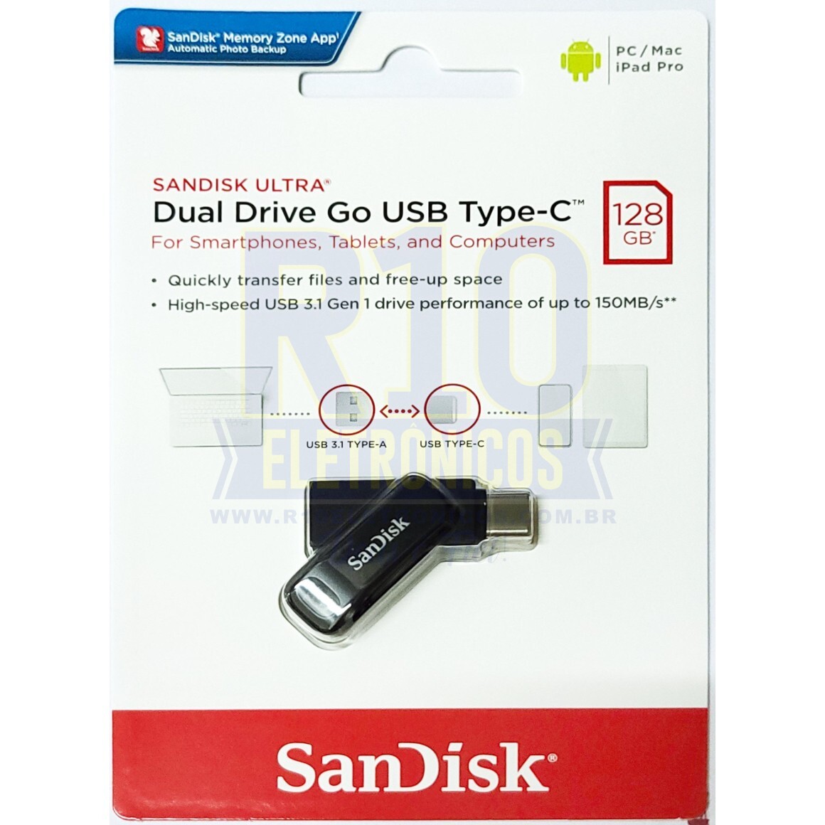 Pen Drive SanDisk 128GB Dual Drive GO USB 3.1 Type-C , Modelo SDDDC3-128G-G46, Capacidade de armazenamento 128 GB.