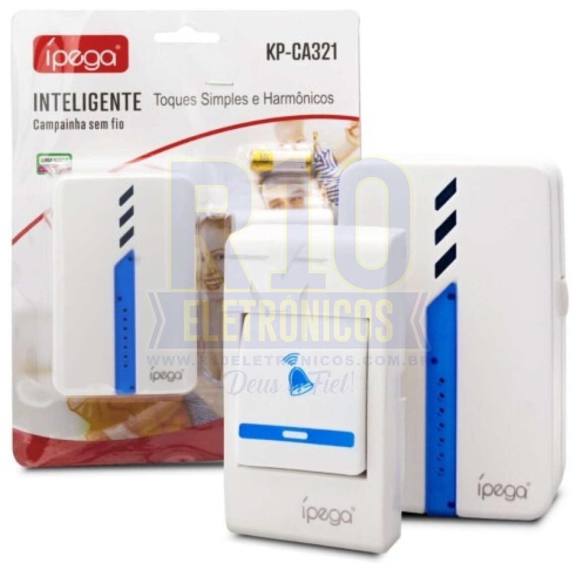 O acionador da campainha vem uma bateria de 23A e 12V, já o receptor da campainha tem sua conexão por meio de uma tomada.
