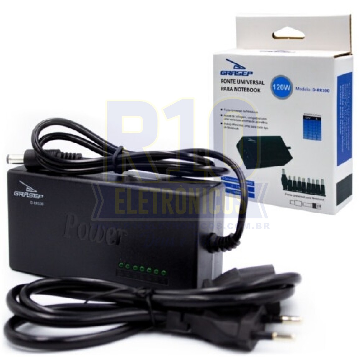 Fonte de alimentação para notebook com ajuste de voltagem, compatível com uma grande variedade de aparelhos notebook. Possui 9 plugues diferentes.