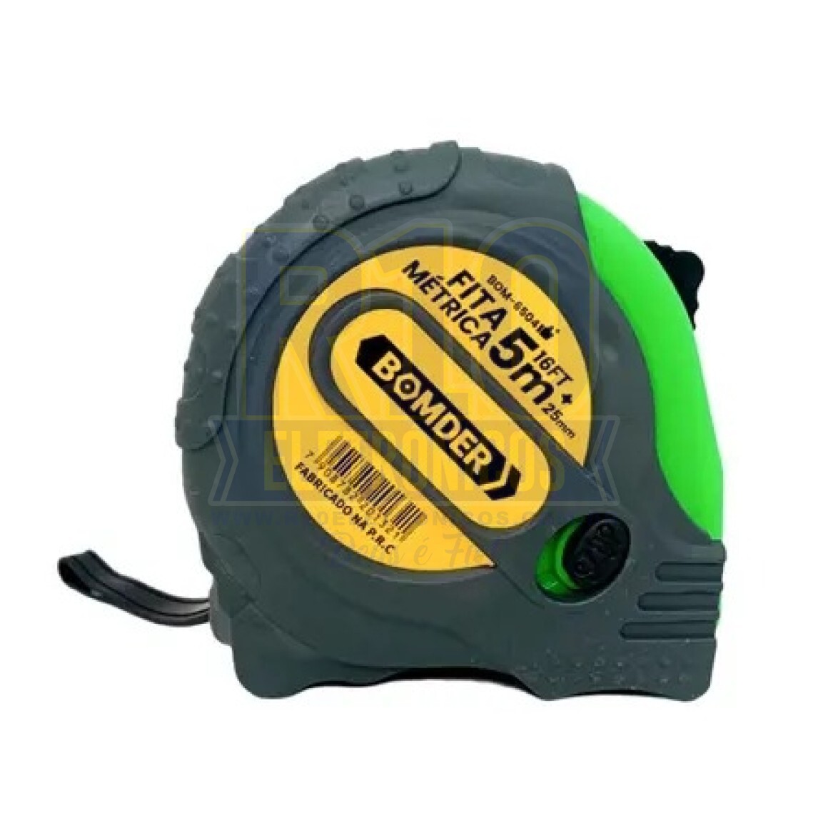 Cinta métrica emborrachada de 5m com trava resistente e precisão milimétrica.