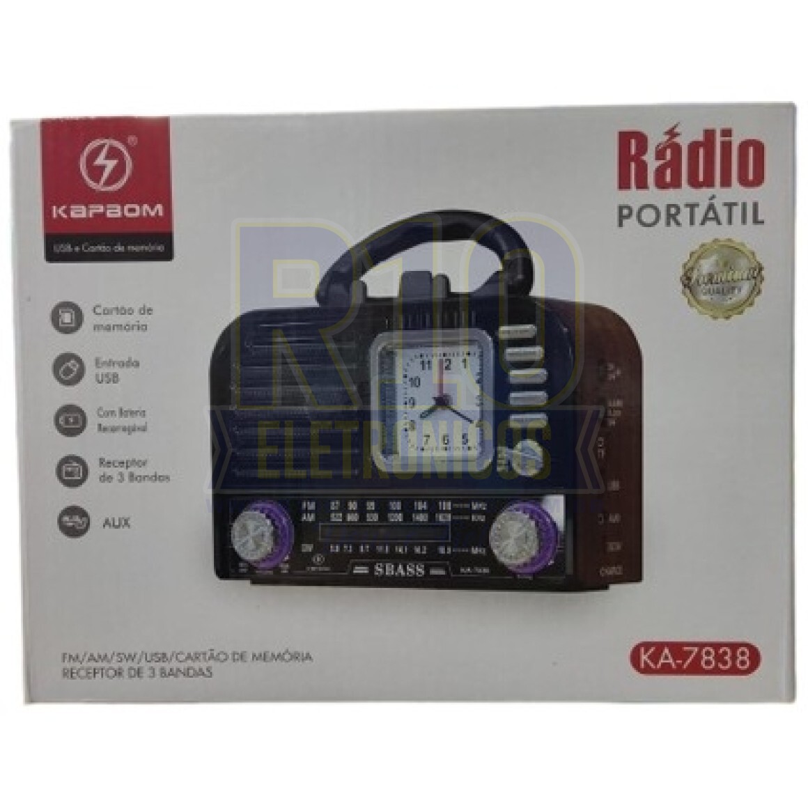 RADIO PORTÁTIL KAPBOM KA-7838 FM/AM/SW/MICRO SD/PENDRIVE COM RELÓGIO