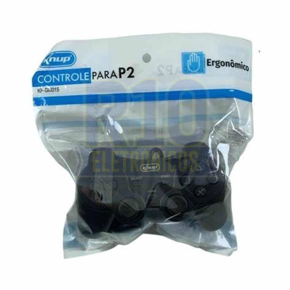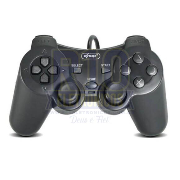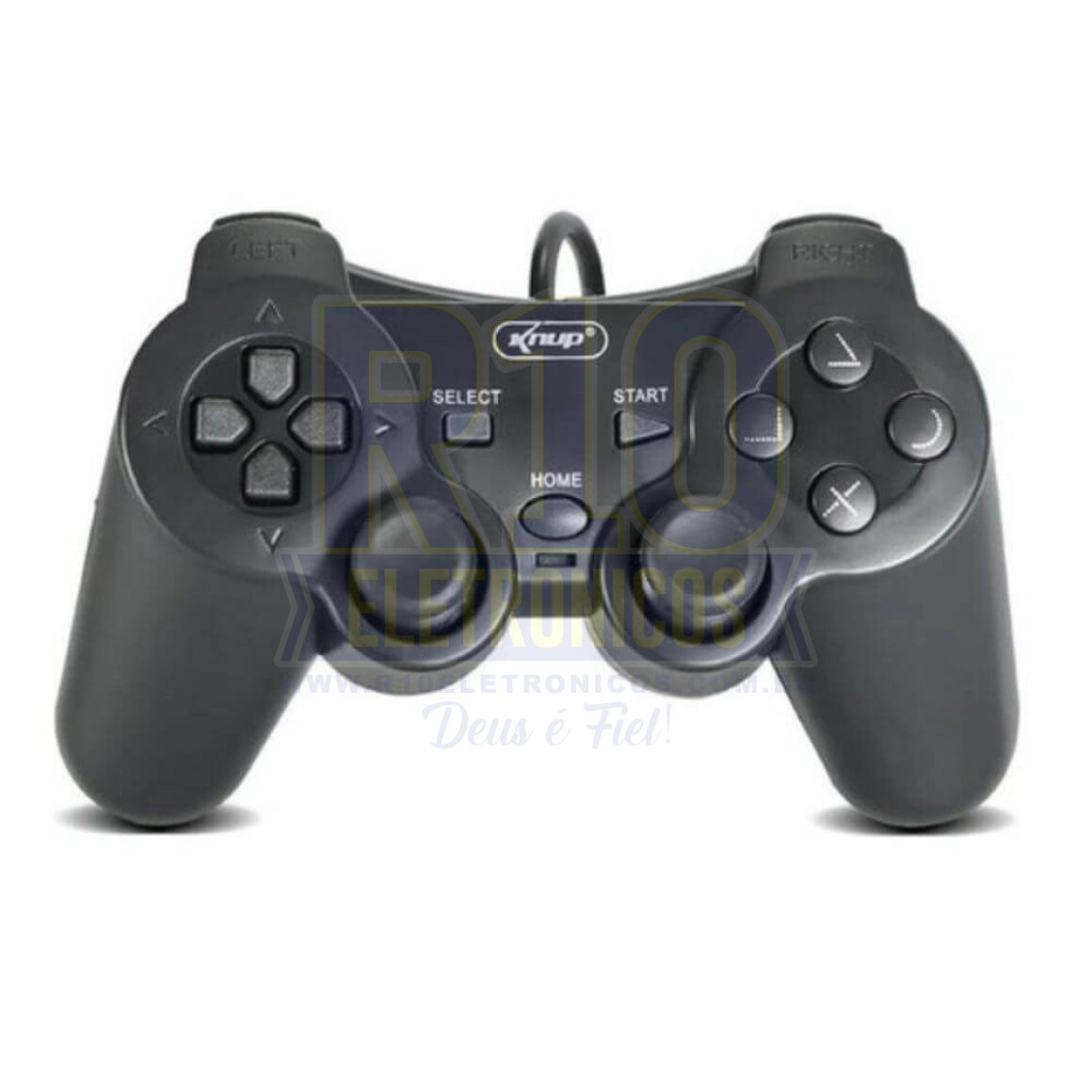 Características Gerais: - 1 Controle Joystick com fio. - 2 Motores de Vibração. - 12 Botões de Função. Marca: Knup. Compatibilidade: PS2 e PS1. Comprimento do cabo: Cabo de cobre com aproximadamente 1.5m. Material: Plástico ABS original. Instalação: Plug and Play. Cor: Preto.