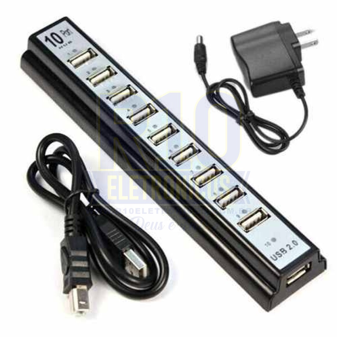 10 portas de alta velocidade USB 2.0 Entrada de alimentação: Adaptador 110V-240V, 50/60Hz Saida 5V DC 2A