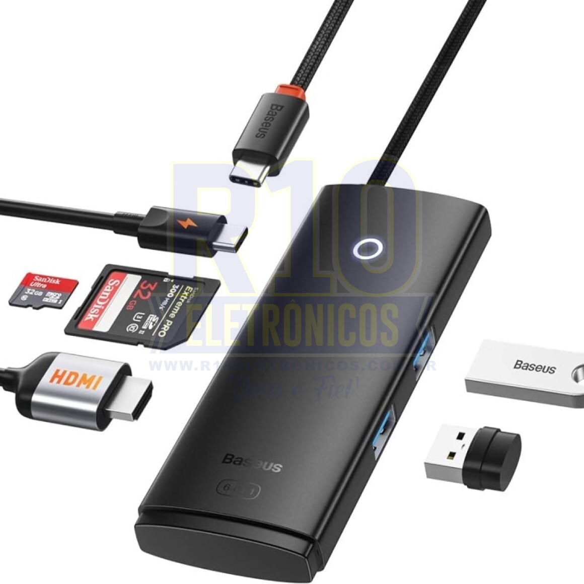 Apresentamos o Hub Adaptador Multiporta Baseus Arjoy 6-Port Type C (BS-OH020) na elegante cor preta! Este dispositivo versátil oferece uma solução de conectividade completa para seu laptop ou dispositivo com porta USB-C, permitindo que você expanda suas opções de conexão.